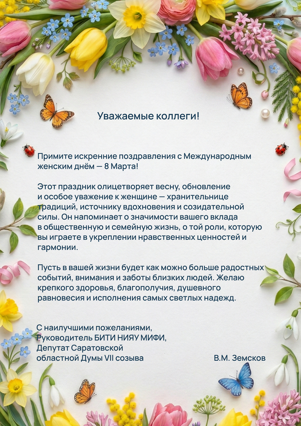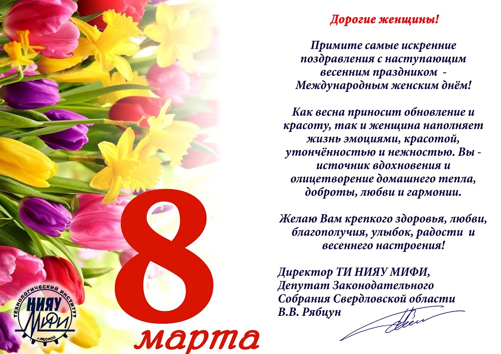 С праздником Весны! Руководитель СарФТИ поздравляет с Международным женским днем 8 марта