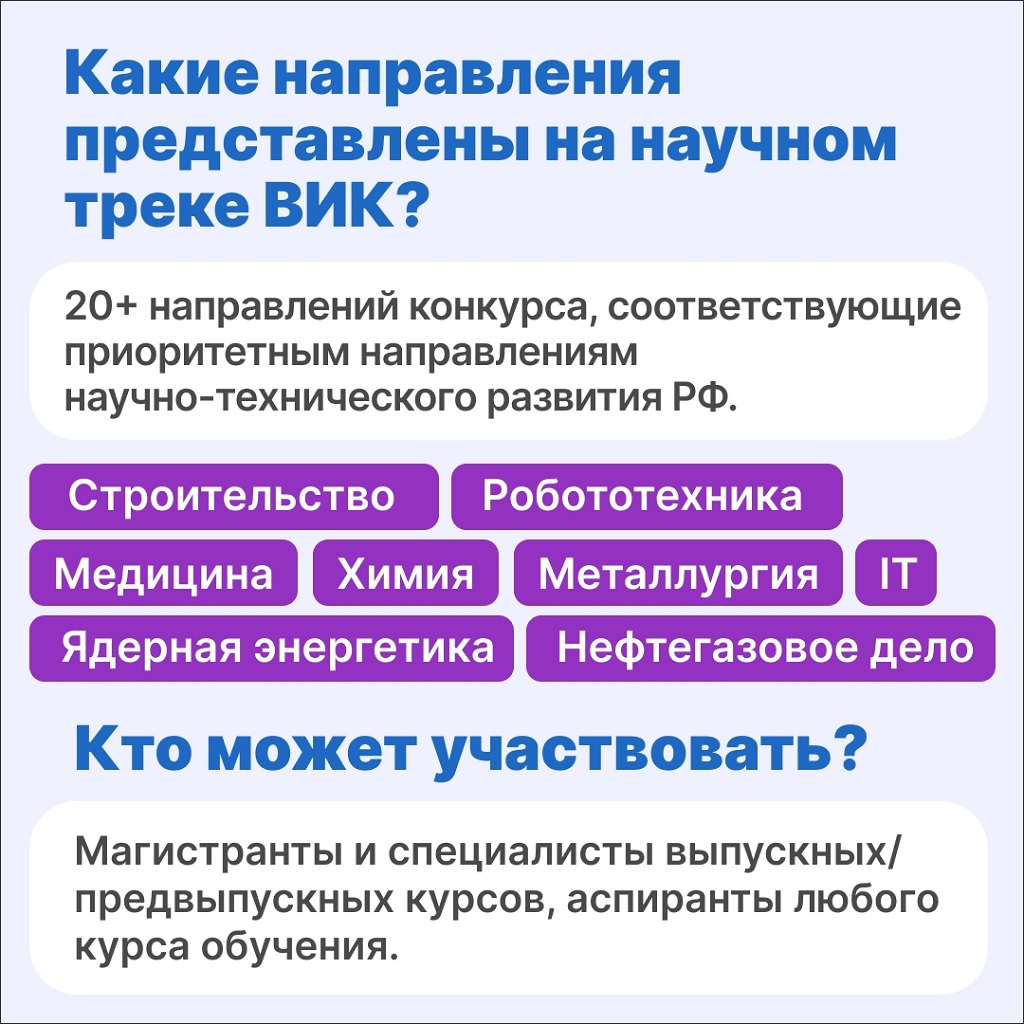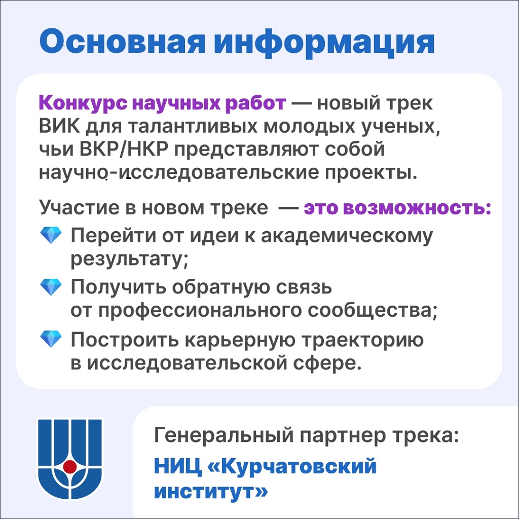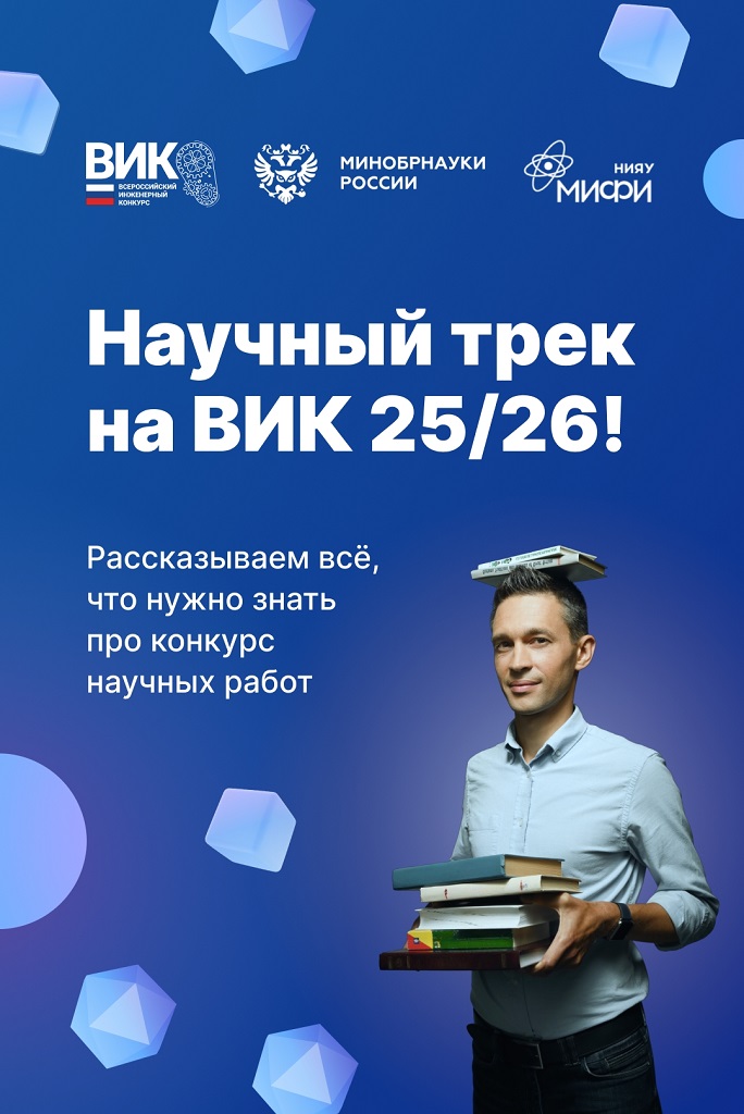 В этом сезоне ВИК открыл свой новый трек для талантливых молодых ученых, чьи ВКП/НКР представляют собой научно-исследовательские проекты – Конкурс научных работ. Если твой проект — это настоящее исследование с потенциалом изменить индустрию, тогда научный трек ВИК 25/26 создан для тебя!