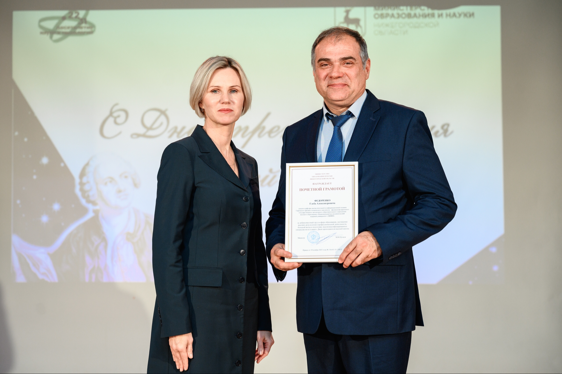 — Наталья Денисова, кандидат педагогических наук, доцент кафедры технологии специального машиностроения, и Глеб Федоренко, кандидат экономических наук, доцент, доцент кафедры вычислительной и информационной техники, и.о. декана факультета повышения квалификации, — Почетных грамот министерства образования и науки Нижегородской области.