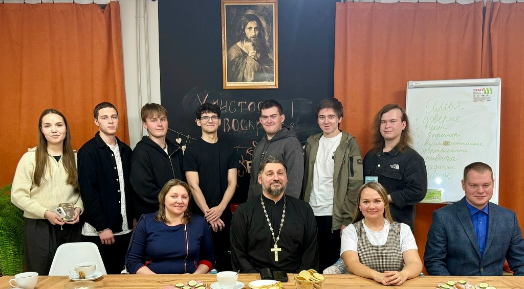 По уже сложившейся традиции встречу провели куратор по молодежной работе Саровского благочиния Анастасия Базаева и священник Сергий Скузоваткин. В этот раз клуб гостеприимно собрал под своей крышей второкурсников из группы АВТ-24 и их преподавателя — доцента кафедры высшей математики Надежду Прокофьеву. Гостем встречи также стал учитель Саровской православной гимназии Артем Понеделко.