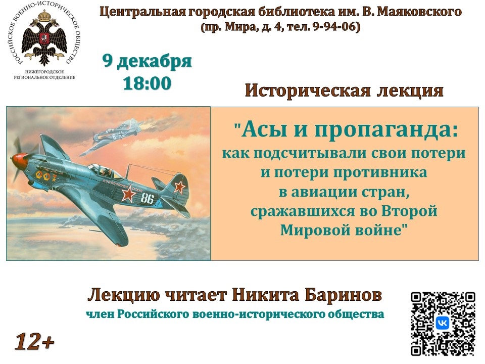 Приглашаем вас 9 декабря на беседу исторической тематики «Асы и пропаганда: как подсчитывали свои потери и потери противника в авиации стран, сражавшихся во Второй мировой войне». Лектор — Никита Баринов, сотрудник РФЯЦ-ВНИИЭФ, член Российского военно-исторического общества. Будут рассмотрены вопросы о количественных показателях сбитых самолетов советскими воинами и немецкими летчиками, о различии в методиках подсчета и о качестве подтверждения успехов истребителей.