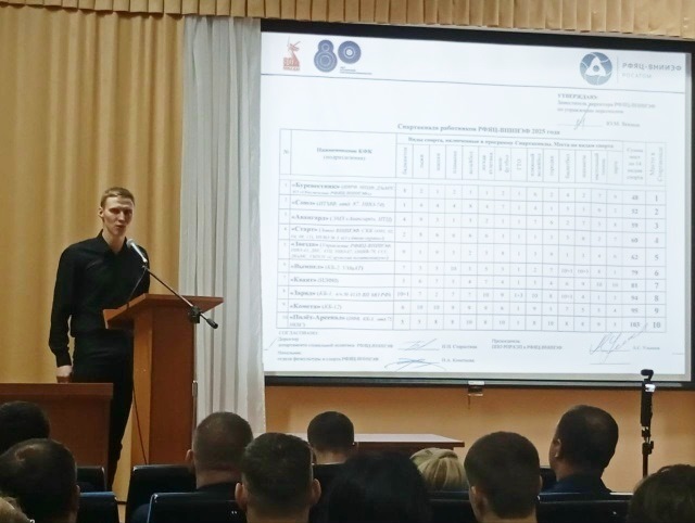 На конференции были названы итоги Спартакиады РФЯЦ-ВНИИЭФ по 12 видам спорта. Третье место занял КФК «Авангард» (председатель — Максим Тюрин), второе — у КФК «Союз» (председатель — Алексей Власов). Победителем стал «Буревестник» (председатель — Александр Андреев). Состоялось награждение 26 сотрудников ВНИИЭФ, внесших наибольший вклад в развитие спорта в уходящем году.