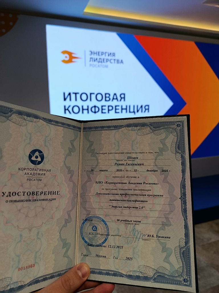 Пройдя в марте-декабре обучение по дополнительной профессиональной программе Корпоративной Академии Росатома, Роман в рамках конференции получил удостоверение о повышении квалификации.