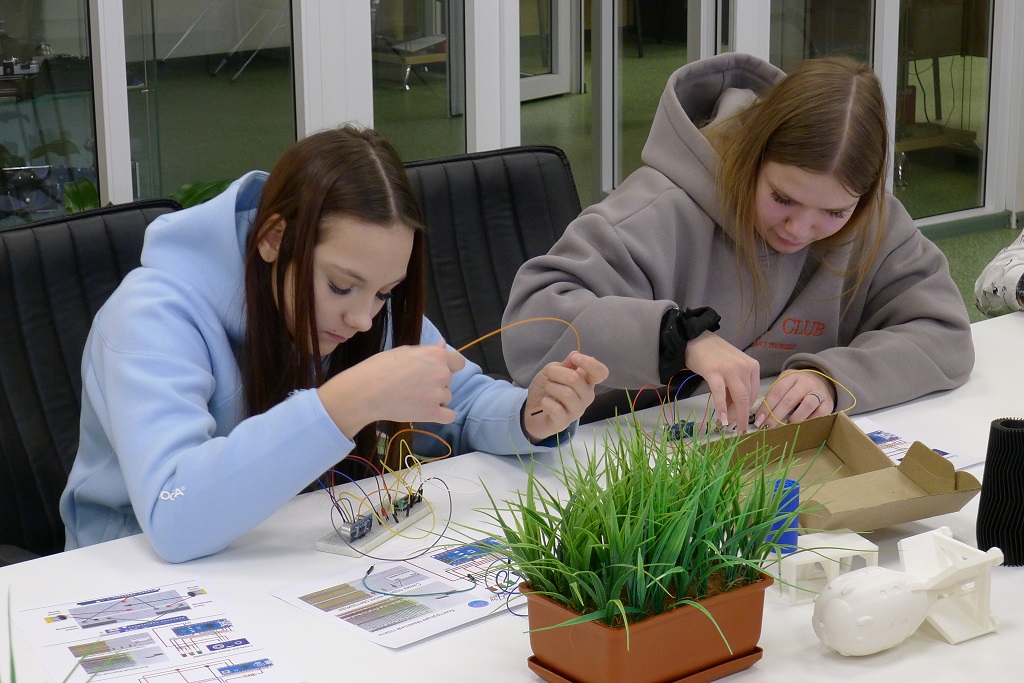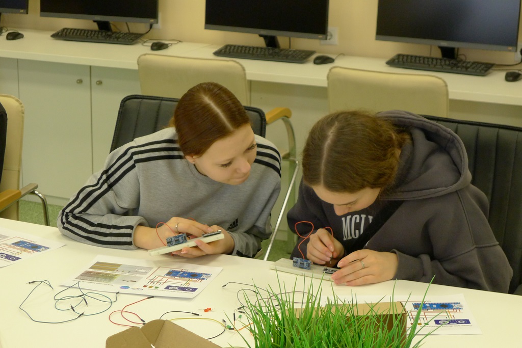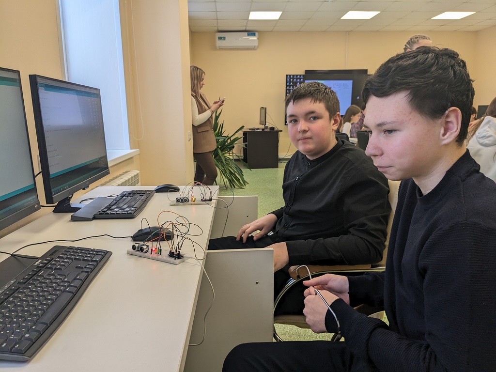 Затем участники проекта погрузились в практикум по сборке электронного устройства — модуля «Парктроник» на базе ультразвукового дальномера, светодиодов и микроконтроллера Arduino. Благодаря поддержке наставников: студента Ивана Ухабова-Богославского и преподавателя Владимира Дюпина — школьники смогли собрать свои первые устройства и проверить их работу.