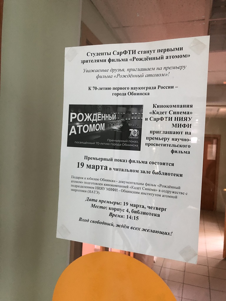 Премьера документального фильма «Рождённый атомом» состоялся в СарФТИ НИЯУ МИФИ в рамках программы просветительской деятельности в студенческой среде университета и при поддержке департамента общественных связей и рекламных коммуникаций НИЯУ МИФИ.