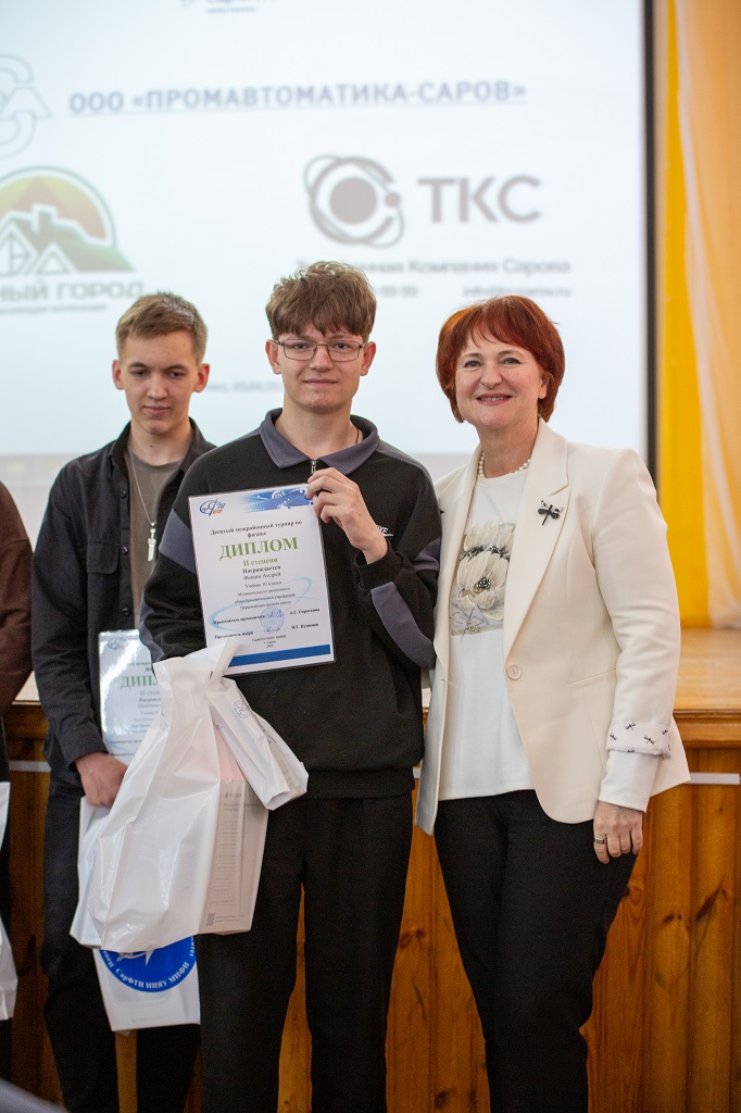 Под общие аплодисменты были названы имена победителей и призеров X Межрайонного турнира по физике — 2026. Поздравление и награждение провели помощник депутата Законодательного собрания Нижегородской области Юрия Якимова Александр Леонтьев, руководитель СарФТИ НИЯУ МИФИ Анна Сироткина, Петр Кузнецов и Юлия Лукина. Призы для награждения: памятные медали, умные колонки «Маруся», портативная колонка, портативный аккумулятор, бутылочка для воды и другие полезные сувениры с символикой турнира — предоставили РФЯЦ-ВНИИЭФ и спонсоры турнира.