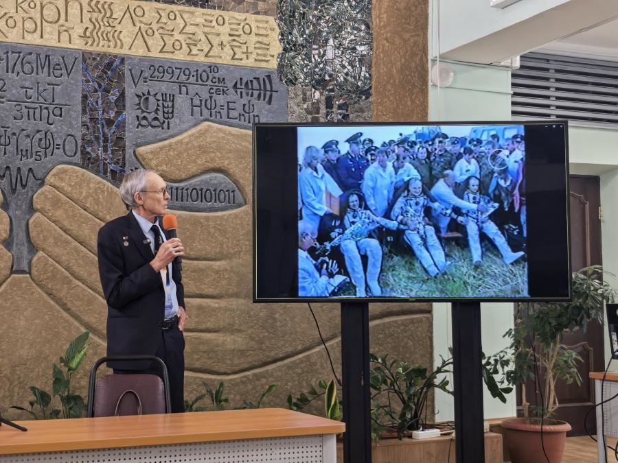 В ходе лекции Сергей Васильевич продемонстрировал уникальные видеокадры жизни и работы на орбитальной станции МИР в составе международного экипажа – как космонавты умываются в специальной капсуле, как пьют летающие капли воды, как из перепелиных яиц, привезенных с Земли, вылупились и пытаются летать в невесомости птенцы перепелов, а два тритона, сцепившись хвостами, парят в воздухе и недоумении, как на МКС растет пшеница…